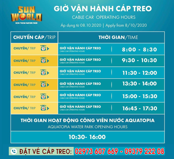 Thời gian vận hành cáp treo áp dụng từ 08/10/2020 đến khi có thông báo mới